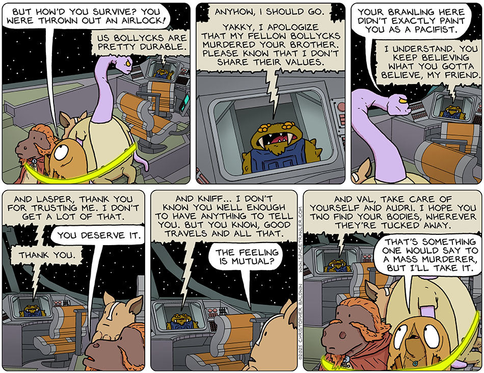 Val yelled to Gerek through the bridge communication system, “But how’d you survive? You were thrown out an airlock!” Gerek replied, “Us Bollycks are pretty durable. Anyhow, I should go. Yakky, I apologize that my fellow Bollycks murdered your brother. Please know that i don’t share their values.” Yakky said, “Your brawling here didn’t exactly paint you as a pacifist.” Gerek said, “I understand. You keep believing what you gotta believe, my friend. And Lasper, thank you for trusting me. I don’t get a lot of that.” Lasper said, “You deserve it.” Gerek said, “Thank you. And Kniff… I don’t know you well enough to have anything to tell you. But you know, good travels and all that.” Kniff said, “The feeling is mutual?” Gerek then finished with saying, “And Val, take care of yourself and Audri. I hope you two find your bodies, wherever they’re tucked away.” Val said, “That’s something one would say to a mass murderer, but i’ll take it.”