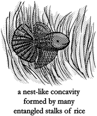 The Khorat Plateau is a high tableland bordered by mountain ranges and the Mekong river to the north. Two rivers drain the enormous plain, the Chi and the Mun, and from April to November the plain is a swamp where rice is grown. Then, for the rest of the year, it is a parched desert, except for the twin rivers, and for the little lakes and bogs where fish of the genus Betta live their lives. They don't mind the poor oxygen or the bad water or the cramped conditions. Bettas can live happily in a cup of water. The home territory of this young Betta was, and had always been, a nest-like concavity formed by many entangled stalks of rice which had spread from a nearby paddy and taken wild root in a ditch. The ditch was nearly waterless most of the year, but the runoff from a nearby hill, and its proximity to the Chi river, prevented it ever drying up completely. The fish was tiny, with metallic blue and black scales, and red tips on his short pelvic fins. Like the catfish that left the rice fields in droves to ride the river to the lake after spawning, he ate water fleas, mosquito larvae, daphnia, ostracods, amphipods, snails, aquatic worms, and the scum that grew on rice stalks. He rarely needed to leave his little dimple, nor cared to. Living at the base of the ditch were giant water bugs, which could suck the life out of a mid-sized frog, and dragonfly larvae, who pounced on anything that moved throughout the wet season, and, when the swamps became barren fields in summer, unfolded their wings and traveled to unknown destinations. The Betta passed his days and nights eating, dreaming, and telling himself stories.