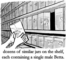 It was a summer morning when the Betta was captured. He was scooped up in a net made from a discarded nylon stocking and dropped, wriggling, into a jar which was then tightly capped. The jar was placed in a bag, where it clinked against other jars, and the drawstring drawn up tight. After a long, disorienting period in the dark, his jar, and the others, was brought into the light and set down on something stationary, a table. Through the glass he could dimly see the shapes of large homo sapiens sapiens all about, and they were making loud noises at each other. He wondered if they were fighting. To calm himself, he told himself a story while they performed their noisy ritual.