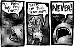 "I can't yield to you even if I wanted to," said the Betta. "We're both trapped here. So I tell you this is my territory." He tried to match the brilliant flaring of the splendens red fins, but his own were short and dull black.