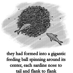 I will never find sardines in all of this, thought the sailfish. I cannot see them in all this mess and I cannot smell them in the cloud of scales and I cannot sense the pressure change of a fish amongst all the birds. I wonder what it is like to be a bird. Perhaps it is very like being a fish and diving for a bird is like jumping for me when I send my whole body clear of the water. It is exhilarating but it cannot be sustained because the sea pulls me down again to where I belong, just as the sky pulls the birds. I must find sardines. I am too late at this feeding ball.