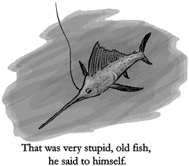 Perhaps they think I am dead, he thought. I have not moved in a long time. If they think I am dead then they will know they cannot pull me up and they will cut the line. This is the last trick I will play on you, fisherman. I did not jump and get in range of your harpoon and your strange thin line will be no use to you if you cut it. The old sailfish found his thoughts coming very slowly.