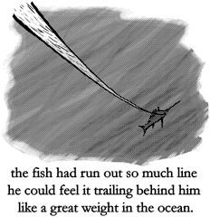 Here we go, he said to himself. Perhaps the hook is not too deep in me and then when I run it will come loose. But he knew that would not be the case and he felt the pain deep in his throat and to the right hand side as he started his run and he felt the line come taught and he felt the fishermanıs hands on the other end of sixty fathoms of line and then he felt the pressure slack off before the line broke but still be tight enough that the fish was now running with all his might and barely moving because he was pulling the entire skiff with him.