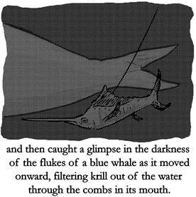 In all his life the fish had never been deeper than one hundred fathoms. Above that depth the rays of the sun could still penetrate and allow phytoplankton to photosynthesize and zooplankton to feed on them. It was an area rich with food but the sailfish knew it was only the roof of the ocean and below it was a dark, strange area where he had never been. Now he dove straight down, unreeling line as he went, to the murky zone where the sun was not visible and neither were other fish. The sailfish felt the lateral lines on his side quiver as though something gigantic were passing and then caught a glimpse in the darkness of the flukes of a blue whale as it moved onward, filtering krill out of the water through the combs in its mouth.