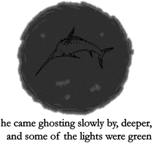 The lights reminded him of the bioluminescence he sometimes saw on the surface of the ocean on summer nights but the lights moved as though they were swimming. Some of the lights were organized in rows and were blue and these were lights on the bodies of squid that moved backwards through the water away from him as he came ghosting slowly by, deeper, and some of the lights were green and they were lights on the bellies of lantern fish.