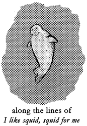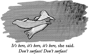 Seals, since they can not make sounds underwater, communicate by a poetic system of acrobatics, or aquabatics, which they refer to simply as 'spinning'. On this morning the seal was expressing his satisfaction at feeding, not in any particularly lyrical way, but just with a sort of mantra along the lines of I like squid, squid for me, of a kind sung by children the biosphere over. The seal was only a few months old.