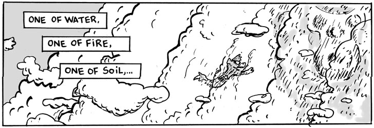 As was suggested in Tuesday’s comments by @Dave, “Googling Yontengu brought up some hits for âYon Tenguâ, Japanese for âfour tenguâ, and a tengu is a supernatural being in Japanese mythology/folklore, sorta like a god or possibly a demon. So, Iâm thinking itâs going to be about the four elemental spirits or something like that. (Chris, am I right?)” Yes, Dave, exactly.